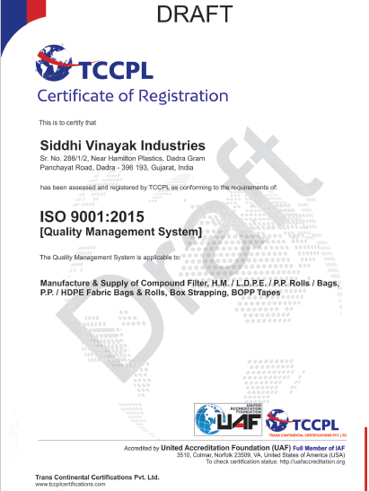 Ganesh Polymers & Siddhi vinayak Industries are leading names in packing material company in India.Ganesh Polymers & Siddhi vinayak Industries are vertically integrated packing material companies those are into manufacturing of packing materials used extensively across industries like textiles, automobiles and other sectors. Read more.....ISO 9001:2015 Certificate
